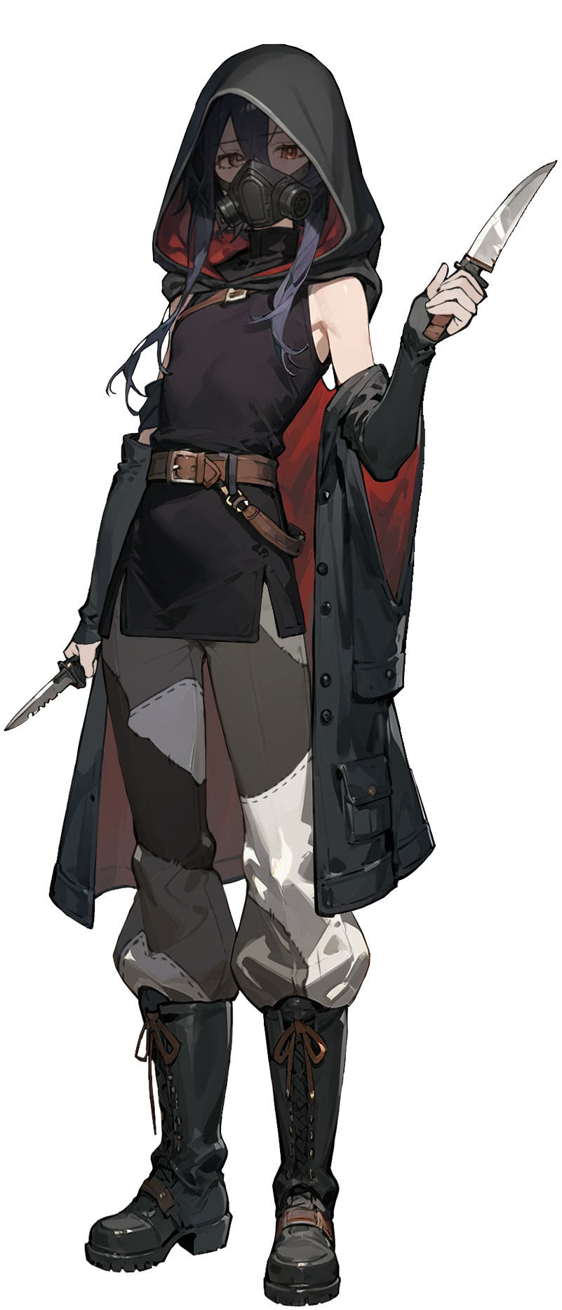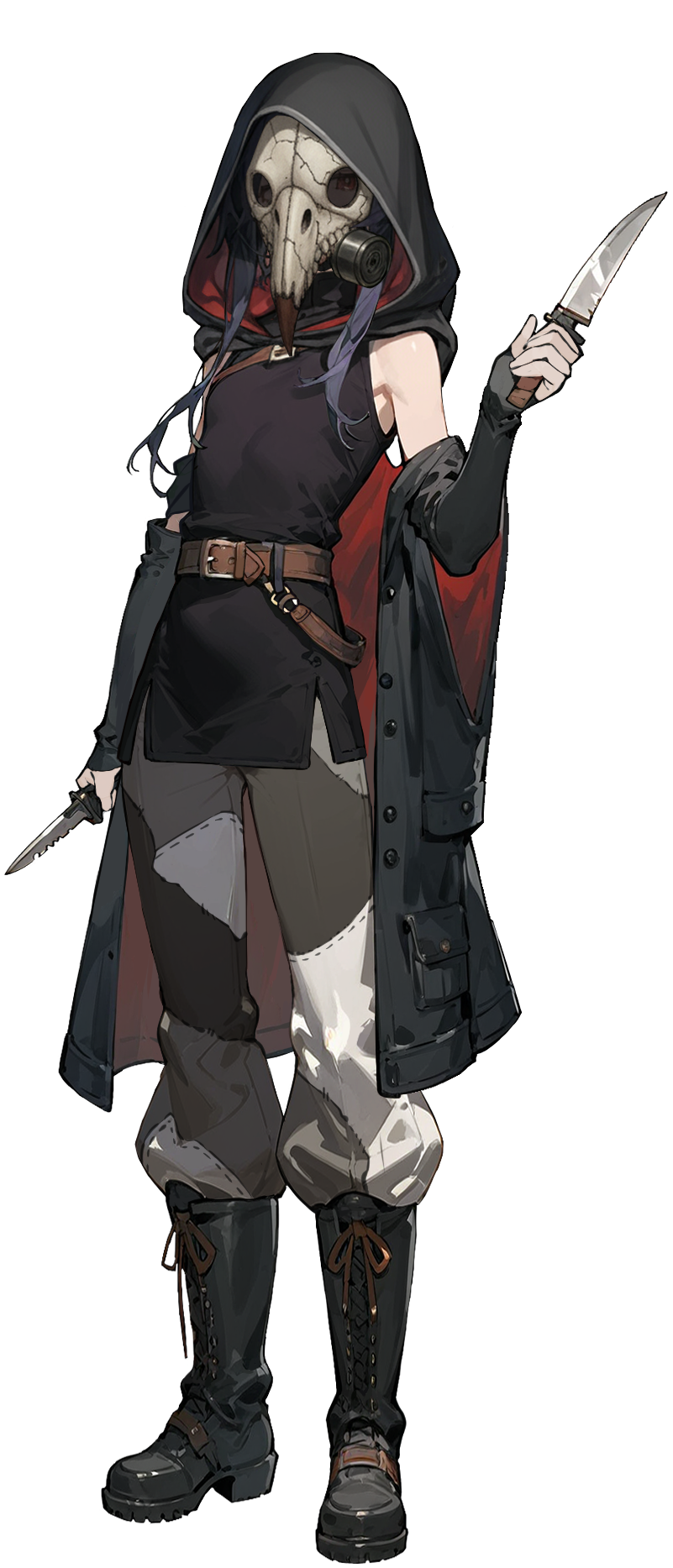 仕事中は骸骨モチーフの仮面(暗殺ならフルフェイス、暗殺以外は口元を覆うハーフマスク)を身に着け、フードを被る。薄手のインナーの上からコウモリ型のコート。下履きは大き目な革製の作業用ズボン。使い古されており、服はところどころつぎはぎ。